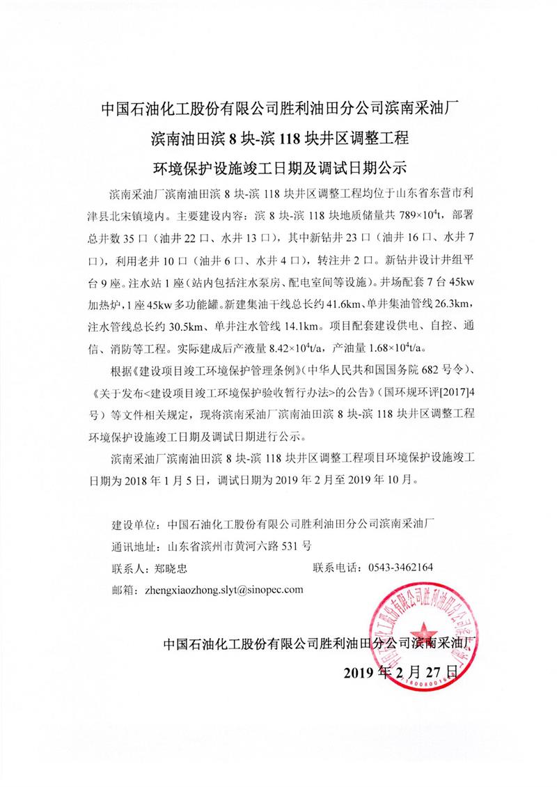 中國(guó)石油化工股份有限公司勝利油田分公司濱南采油廠濱8塊-濱118塊井區(qū)調(diào)整工程環(huán)境保護(hù)設(shè)施竣工日期及調(diào)試日期公示